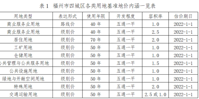 5.基准地价容积率:福州市四城区的商业服务业用地路线价为标准深度30米或50米,容积率为1.0,建筑密度为100%,商业服务业用地的标准容积率为2.5,居住用地的标准容积率为2.0,公共管理与公共服务用地的标准容积率为1.5,工矿用地、仓储用地、公用设施用地、绿地与开敞空间用地的标准容积率为1.0,交通运输用地的标准容积率为1.0(其中交通场站用地、其他交通设施用地的标准容积率为2.5),特殊用地的标准容积率为2.0。