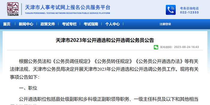 关注8月24日,天津市人事考试网上报名公共服务平台网站发布了《天津市2023年公开遴选和公开选调公务员公告》。