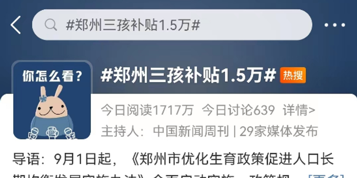 消息发布后,#郑州三孩补贴1.5万#的词条迅速登上微博热搜,并成为郑州同城榜热度第一位。不少网友留言称“生晚了”“开生”,并期待政策落地。