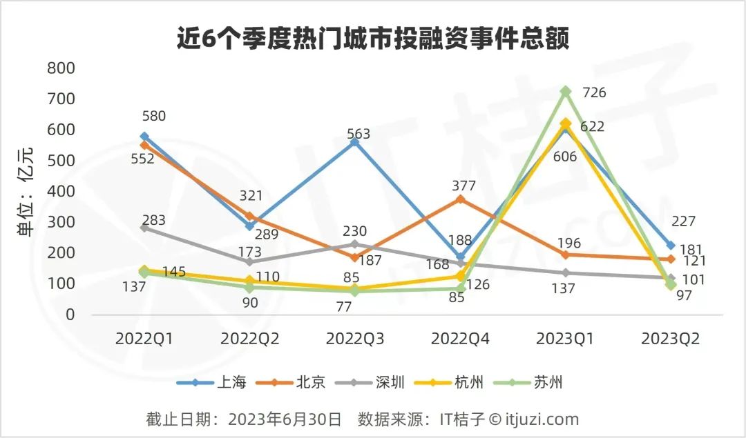规模上,上半年,苏州投融资事件总额高居五大城市之首,高达823亿。