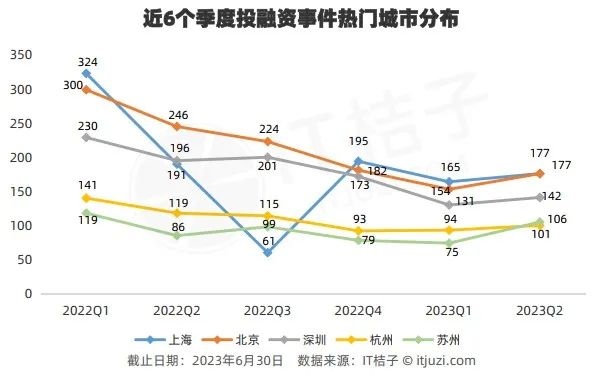 从投融资数量看,在刚刚过去的二季度,北京与上海并列成为全国投融资第一高地。苏州投融资事件数量6个季度以来首次赶超杭州。