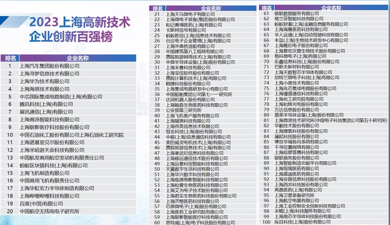 上海社会科学院应用经济研究所、上海市科技创业中心、上海工程技术大学近日联合发布了“2023上海高新技术企业创新百强榜”,旨在全方位呈现上海高新技术企业的创新发展水平,树立标杆引领企业,推动高企实现更高质量发展。在这个榜单上,排名前十的企业依次是:上海汽车集团股份有限公司、上海寻梦信息技术有限公司(拼多多)、上海华为技术有限公司、上海海思技术有限公司、中芯国际集成电路制造(上海)有限公司、腾讯科技(上海)有限公司、展讯通信(上海)有限公司、上海商汤智能科技有限公司、上海联影医疗科技股份有限公司、中国石油化工股份有限公司上海石油化工研究院。
