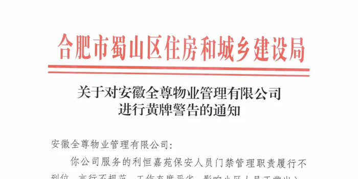 关注9月30日,安徽商报融媒体记者从合肥市住房保障和房产管理局获悉,该市住建部门发布通知,因服务管理不到位,对安徽全尊物业管理有限公司处以黄牌警告的处罚。