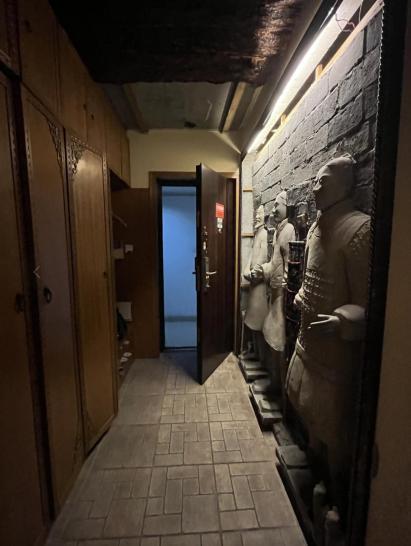 推开公寓楼平淡无奇的防盗门,映入眼帘的是几尊接近原始比例的“兵马俑”。接下来,和兵马俑的亲密接触就没有停止过,从进门玄关处开始,就有几个带刀侍卫列队欢迎你。在卧室两面墙上,床头边上,都站立着不同的兵马俑。沙发背景墙、阳台上,甚至在卫生间,洗漱台下方,马桶正前方,一个5平方米的卫生间,也挤了几个兵马俑。