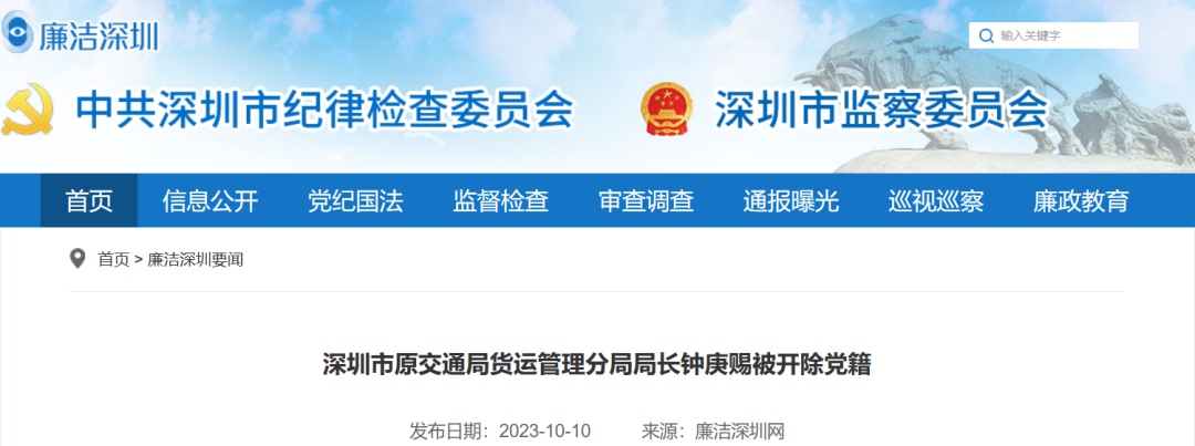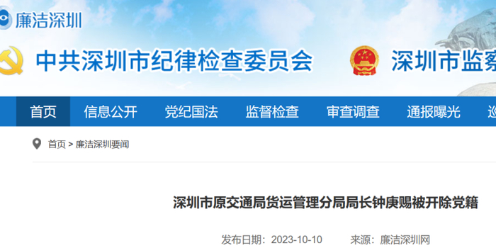 10月10日,深圳市纪委监委通报称,日前对深圳市原交通局货运管理分局局长钟庚赐严重违纪违法问题进行了立案审查调查。