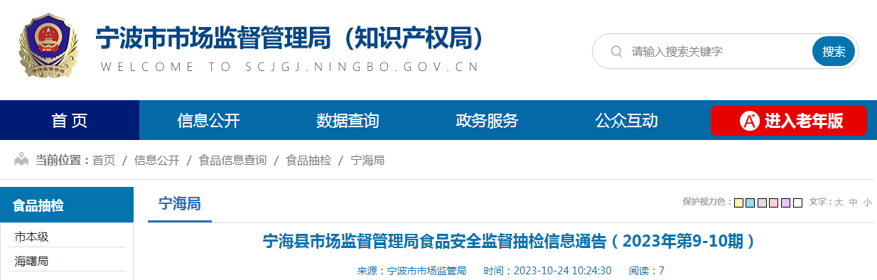宁海王奇副食品店销售的白话梅不符合标准要求;宁海县方波干水产经营部销售的白芷不符合标准要求;宁海县胡林英副食品店销售的白芷不符合标准要求;宁海县西店辰锐调味品店销售的白芷不符合标准要求;宁海县筋斗云水果店销售的柿饼不符合标准要求;宁海县老墙弄川菜馆销售的牛蛙不符合标准要求;宁海喜字蜀芗阁餐饮店销售的牛蛙不符合标准要求;宁海满湘红饭店销售的花生米不符合标准要求。检验机构为宁波市产品食品质量检验研究院(宁波市纤维检验所)。