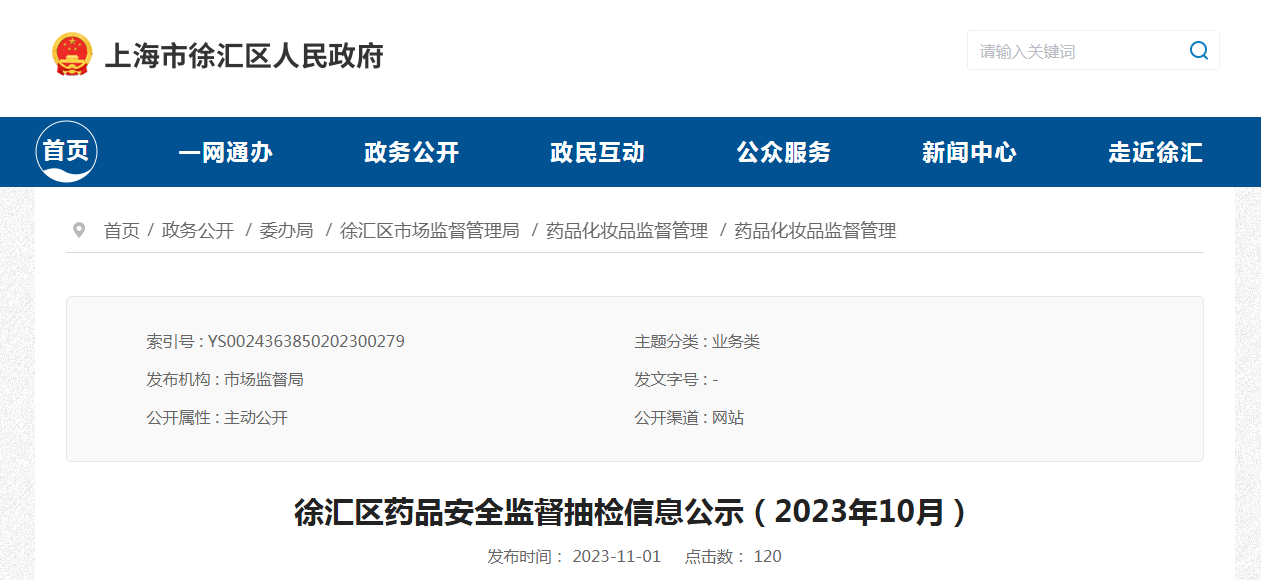 上海市徐汇区公示药品安全监督抽检信息(2023年10月)
