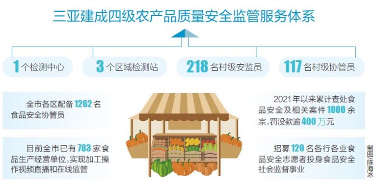 这并非孤例。海南日报记者了解到,三亚花“大力气”压实食品安全属地管理和企业主体“两个责任”,指导全市食品生产经营企业按要求配备食品安全总监、食品安全员,实现应配尽配。目前,三亚建成“1个检测中心,3个区域检测站,218名村级安监员,117名村级协管员”四级农产品质量安全监管服务体系,全市各区配备1262名食品安全协管员,打通食品安全监管“最后一公里”。
