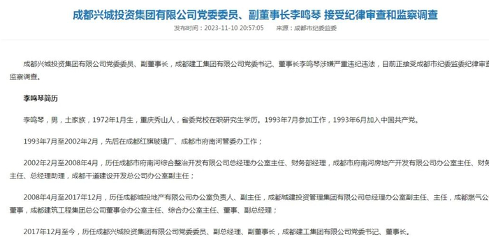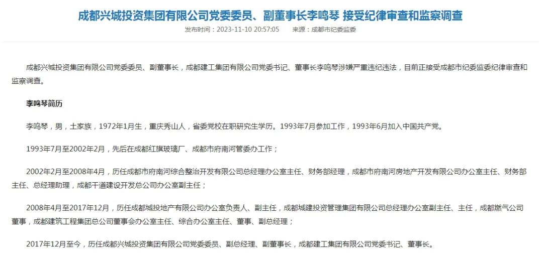 成都市纪委监委网站10日晚发布消息,成都兴城投资集团有限公司党委委员、副董事长,成都建工集团有限公司党委书记、董事长李鸣琴涉嫌严重违纪违法,目前正接受成都市纪委监委纪律审查和监察调查。