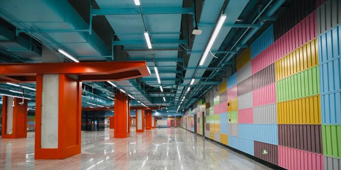临近珠江沿岸的五号线东延段,每个站的取色则源于海港、海岸、自然之色。作为文化主题站的黄埔新港站以黄埔港“帆樯如云”的“云”作为场景的主要元素,用层叠的白色吊顶表达云层的变化,蓝色浅渐变色方管模仿多变的云,仿若把阴晴变幻的天气浓缩到小小的地下空间中。“云层”里随机设置高低错落的筒灯来模拟隐约星空,寓意新的希望和对美好的无限向往。