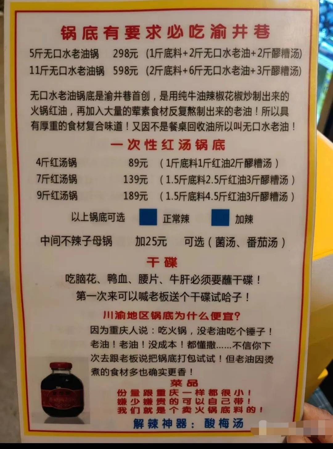 在菜单栏还可以看到,“无口水老油”是该店的特色,菜单也向消费者“强烈推荐”着自家的锅底,“锅底有要求,必吃渝井巷”“无口水老油锅底是渝井巷首创,是用纯牛油辣椒花椒炒制出来的火锅红油,再加入大量的荤素食材反复熬制出来的老油!所以具有厚重的食材复合味道” 。