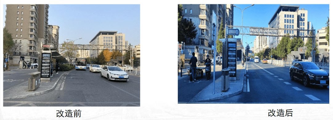 二是改造前非机动车行驶路径不明确、非机动车道宽度不足,本次调整了非机动车流线、增设地面彩色铺装,明确了非机动车行驶路径,优化了路口慢行交通组织。
