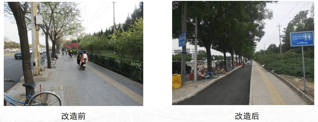 所以我们对2条道路的慢行系统进行整体改造,按照标准断面设置专用自行车道和人行道,这样就能改善骑行环境的同时,将行人与非机动车进行分离,从而优化交通秩序,降低安全隐患。