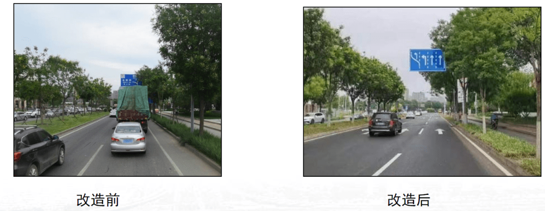 我们去现场进行了很多次调研,上面提到的交通需求都存在、无法通过其他道路进行分流。为了改善交通秩序,根据车辆行驶轨迹微调机动车、慢行行驶轨迹,增设路面彩铺、施划导流区等方式改善交通组织。