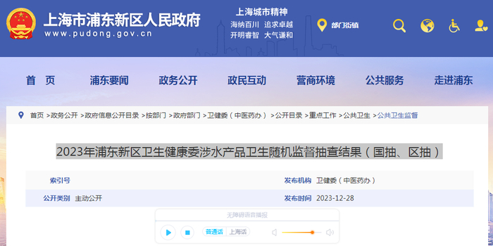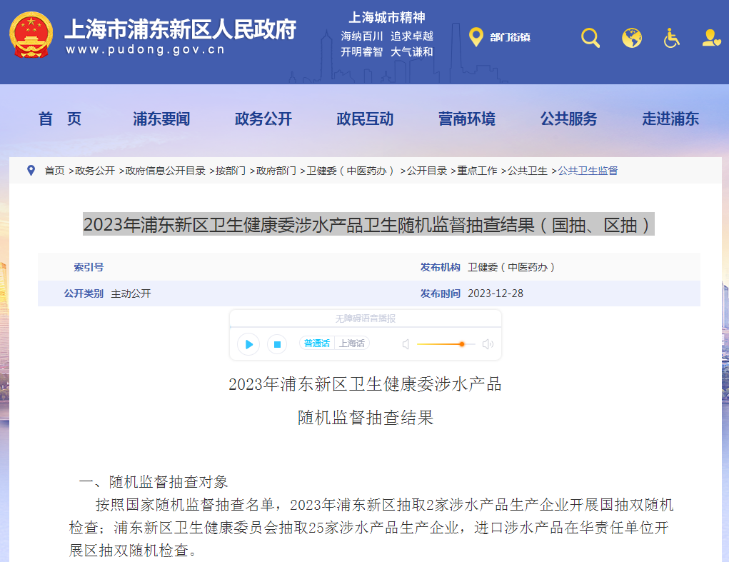 2023年上海市浦东新区卫生健康委涉水产品卫生随机监督抽查结果(国抽、区抽)
