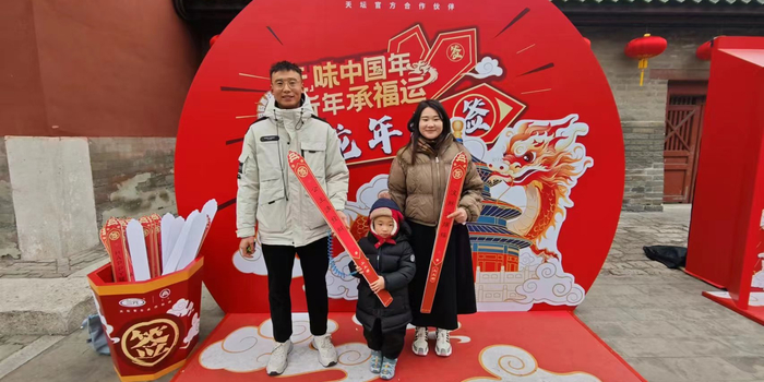 “公主请发财”“没胖没烦恼”……1月30日,来自河北邯郸的申女士在北京天坛公园游玩,三元食品设立的“龙年福签”打卡墙吸引了她和家人的注意。
