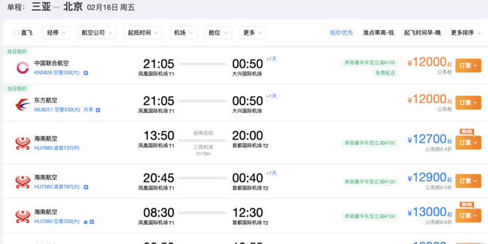 正月初七,三亚前往北京的机票情况。图源:携程网截屏