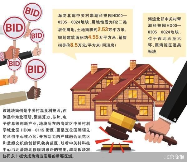 根据出让文件,海淀北部中关村翠湖科技园HD00—0305—0024地块,用地性质为R2二类居住用地,土地面积约2.53万平方米,规划建筑面积约4.55万平方米,销售指导价8.5万元/平方米(同现房)。