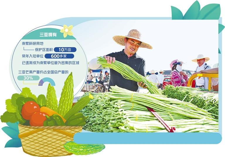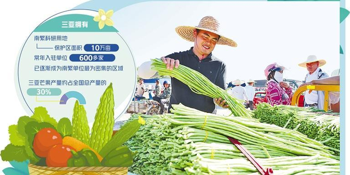 三亚蔬果业繁荣有赖于南繁种业基地的赋能。三亚拥有南繁科研用地保护区面积10万亩,常年入驻单位达600多家,已逐渐成为南繁单位最为密集的区域。每年冬春,来自全国各大农业科研机构的6000名专家人才汇聚于此,田地间、实验室、人才小院处处可见他们的身影,培育出最适合生长在三亚市崖州区这片土地上的“致富苗”。
