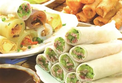 春饼,是一种烙得很薄的面饼,又称薄饼,“二月二,吃春饼”也被叫做咬“龙鳞”,是因春饼圆且薄的形状好似鳞片而得名。这种习俗据传源于清代,其吃法简单,用白面烙成的双层荷叶饼,可以揭开,涂上甜面酱,卷上“盒子菜”,也就是木须肉、豆牙拌粉丝、酱肘子、胡萝卜丝等。