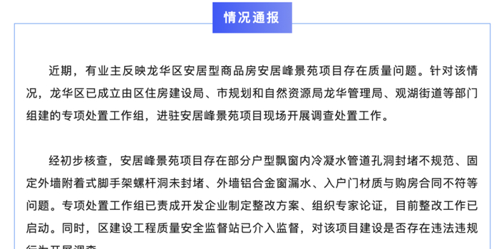通报称,经初步核查,安居峰景苑项目存在部分户型飘窗内冷凝水管道孔洞封堵不规范、固定外墙附着式脚手架螺杆洞未封堵、外墙铝合金窗漏水、入户门材质与购房合同不符等问题。专项处置工作组已责成开发企业制定整改方案、组织专家论证,目前整改工作已启动。同时,龙华区建设工程质量安全监督站已介入监督,对该项目建设是否存在违法违规行为开展调查。