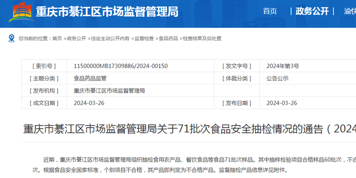 重庆市綦江区市场监督管理局关于71批次食品安全抽检情况的通告(2024年第3号)