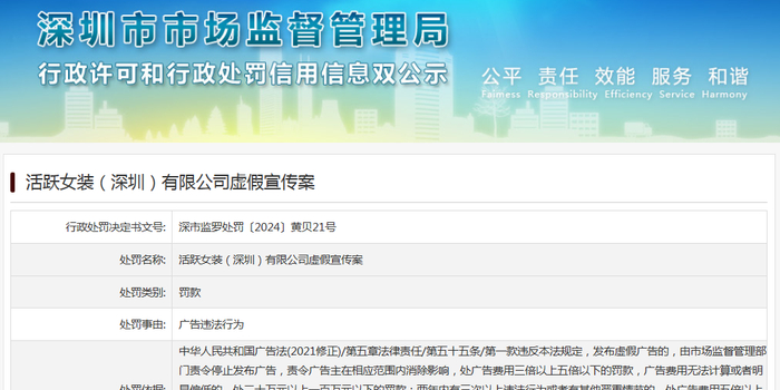 活跃女装(深圳)有限公司虚假宣传案 2024.04.02 15:29:09 深圳市市场监督管理局(深圳市知识产权局)(深圳市知识产权局)信用信息“双公示”活跃女装(深圳)有限公司虚假宣传案 分享文章到: