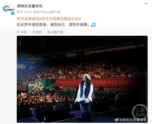 按照计划,5月25日,许美静还将在武汉举办“梦见许美静见面音乐会”。而南京、武汉的活动主办方,均为深圳太古宙文化传播有限公司。4月22日,上游新闻记者联系上该公司,工作人员表示,针对目前情况,已经暂停武汉站音乐会的销售工作,此外还将许美静经纪团队的相关回应发给了记者。