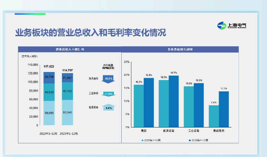 上海电气相关负责人在业绩会现场分析称,2023年扭亏为盈原因是各业务毛利上升、加大应收账款催收、金融资产价值上升。