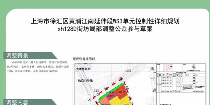 根据公示内容,xh128D街坊位于徐汇区斜土街道南部,黄浦江南延伸段WS3单元内。东至兆丰路,西至大木桥路,北至中山南二路,南至龙华中路,总用地面积8.36公顷。