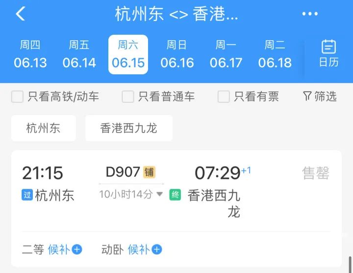 昨天(6月5日)12时,车票正式开售!截至6月6日14:30,6月15日至6月17日,D907次列车从上海虹桥站至香港西九龙站的动卧和二等座仍可正常购买,从杭州东站出发至香港西九龙站的车票显示为“候补”状态。