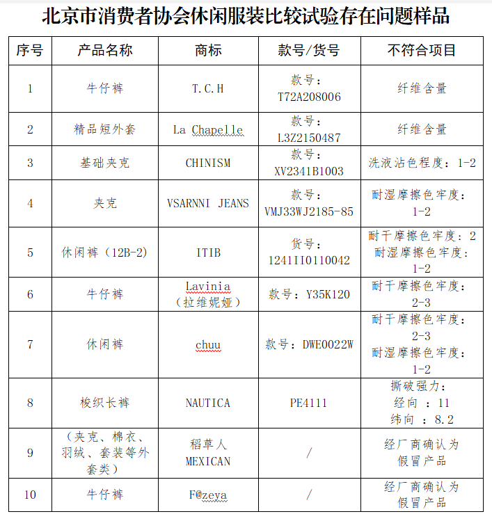 北京市消协发布休闲服装比较试验结果 诺帝卡、拉夏贝尔等10件样品存在质量问题 2件样品为冒牌货