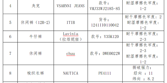耐摩擦色牢度、洗液沾色程度。本次比较试验中,“CHINISM”等品牌的样品洗液沾色程度不符合相关标准要求。色牢度差的纺织品容易脱落和褪色,脱落的染料分子或重金属离子可能被人体吸收而危害健康。“VSARNNI JEANS”“ITIB”“chuu”品牌的3件样品耐湿摩擦色牢度不符合相关标准要求,“Lavinia(拉维妮娅)”“ITIB”“chuu”品牌的3件样品耐干摩擦色牢度不符合相关标准要求。耐摩擦色牢度是指染色织物经过摩擦后的掉色程度,考核的是染料对机械摩擦作用的抵抗能力,分为干摩擦和湿摩擦;洗液沾色程度模拟了消费者在洗涤过程中出现变色及沾色情况。