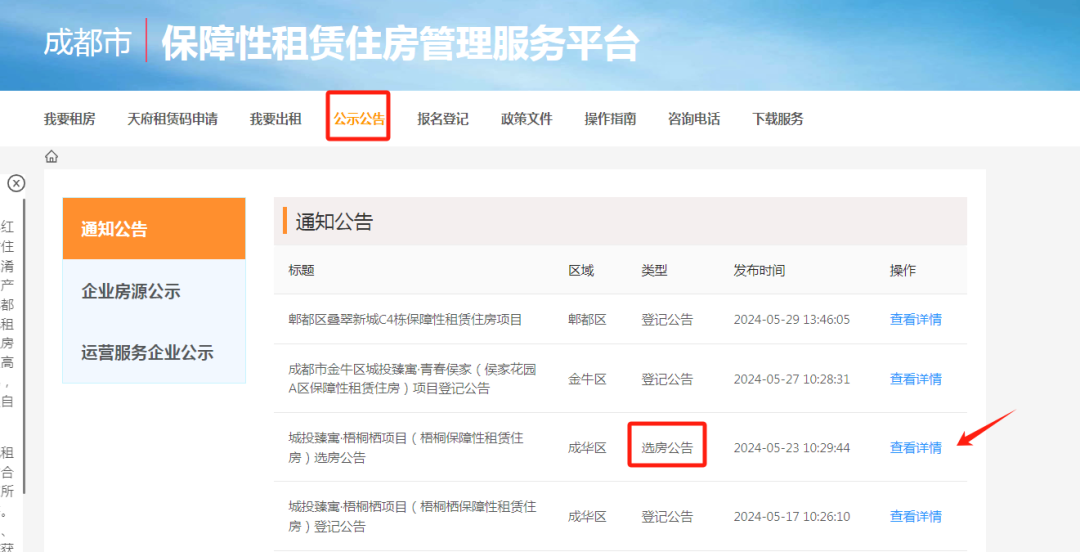 第二步:取得租赁码后,您可在保障性租赁住房管理服务平台里点击“我要租房”专栏,进入房源查看界面。同时,可以点击“公示公告”专栏查看近期项目登记、选房情况。