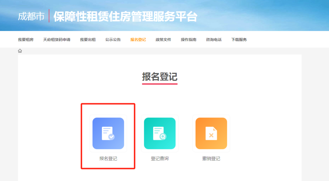 第三步:保障性租赁住房项目推出后,您可在保障性租赁住房管理服务平台点击“报名登记”,选择项目进行登记,登记成功的时间先后顺序将作为选房顺序。