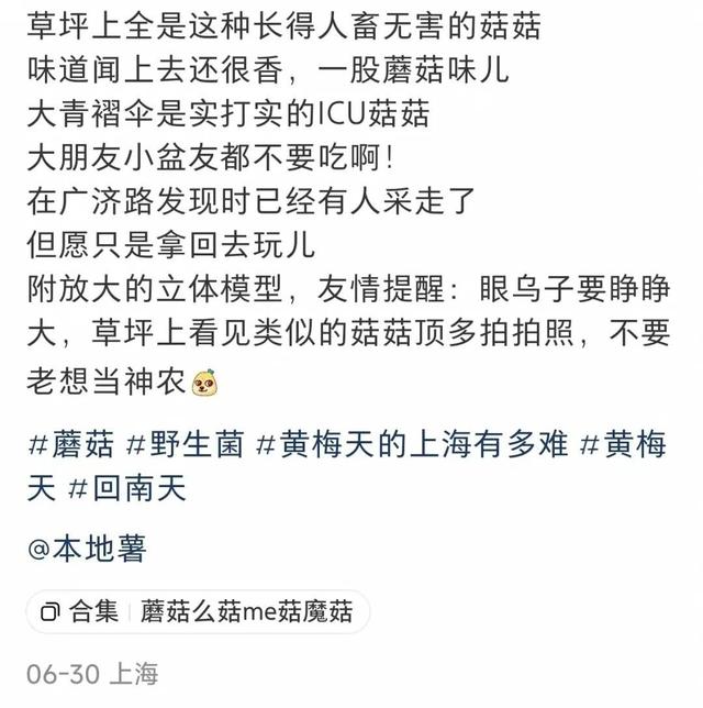 记者7月1日从沪上多座公园了解到,近期的确有野生菌类大规模“露头”的现象,绿化市容部门和行业专家均发出紧急提醒,市民游客切勿采摘,以免误认误食引发食物中毒甚至威胁生命。