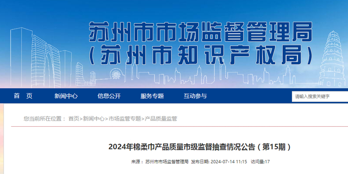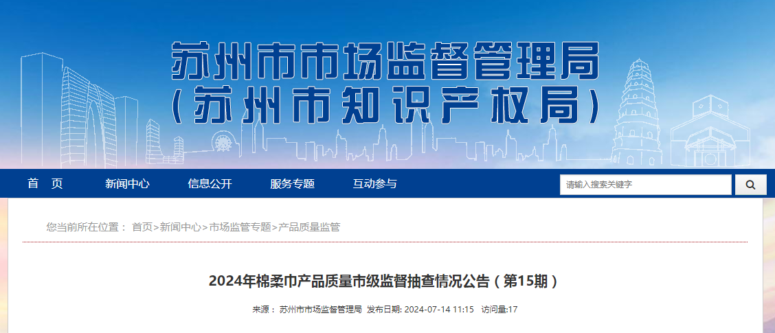 【江苏省苏州市】2024年棉柔巾产品质量市级监督抽查情况公告(第15期)