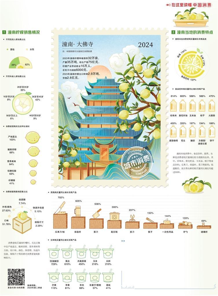重庆市潼南区地处北纬30度柠檬黄金种植带,气候温润、地势浅平,是世界三大优质柠檬产地之一。这里的柠檬个大饱满、香气浓郁,是国家地理标志产品,被纳入国家生态原产地产品保护名录。潼南区的柠檬种植面积达32万亩,2023年产鲜果35万吨,综合产值75亿元。