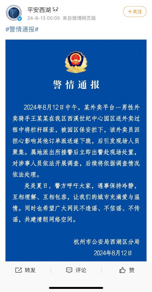 【环球网科技报道 记者 李文瑶】8月12日晚间,杭州市公安局西湖分局发布警情通报,称有男性外卖骑手在送餐过程中因踩歪围栏与园区保安发生冲突后下跪,引发人员聚集,并呼吁大家遇事保持冷静,希望大家不造谣、不信谣、不传谣。