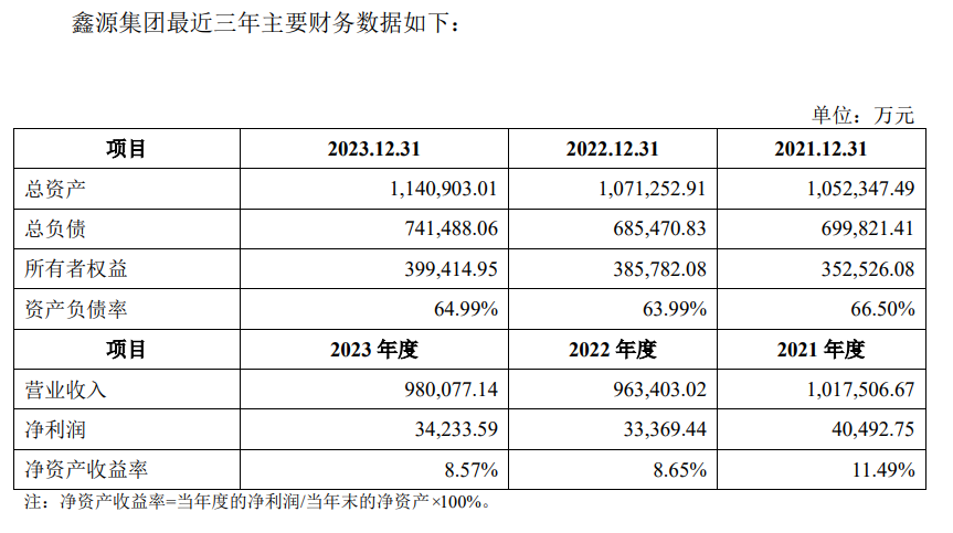 东方鑫源集团财务数据显示,2021年-2023年其总资产分别为105亿、107亿、114亿元,营业收入101亿、96亿、98亿元,净利润4亿、3.3亿、3.42亿元。