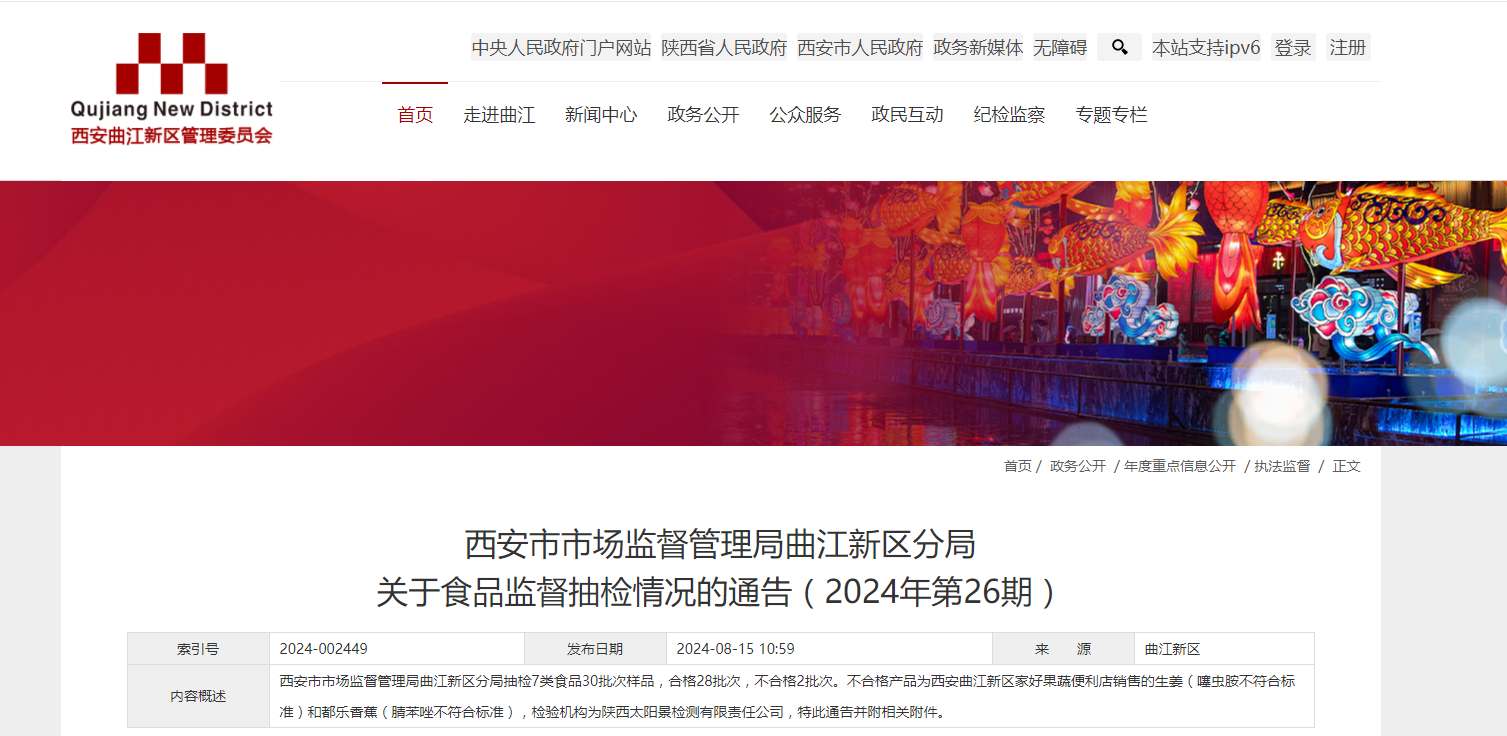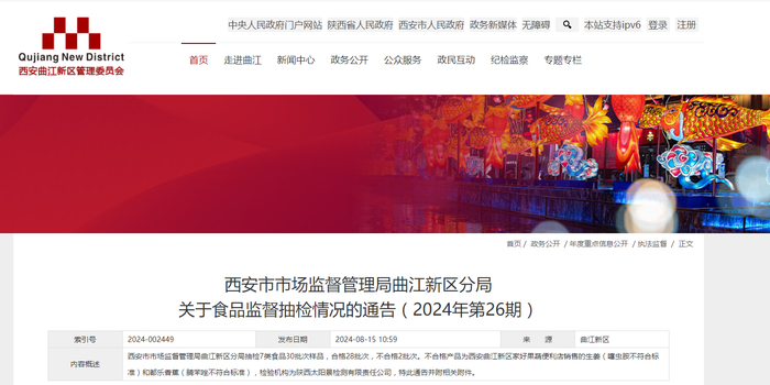 西安市市场监督管理局曲江新区分局关于食品监督抽检情况的通告(2024年第26期)