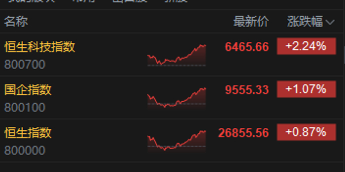 今日,港股三大指数高开高走。截至收盘,恒生指数涨0.87%,报26855.56点,恒生科技指数涨2.24%,国企指数涨1.07%。盘面上,科网股全线上涨,快手涨超7%,哔哩哔哩涨超6%,阿里巴巴、网易涨超2%,美团、京东、百度张超1%;半导体板块强势,华虹半导体涨超10%;创新药概念走高,药明康德涨超8%;苹果概念拉升,伟仕佳杰涨超9%;今日三只新股上市,西普尼涨近260%,紫金黄金国际涨超68%,博泰车联涨超53%。