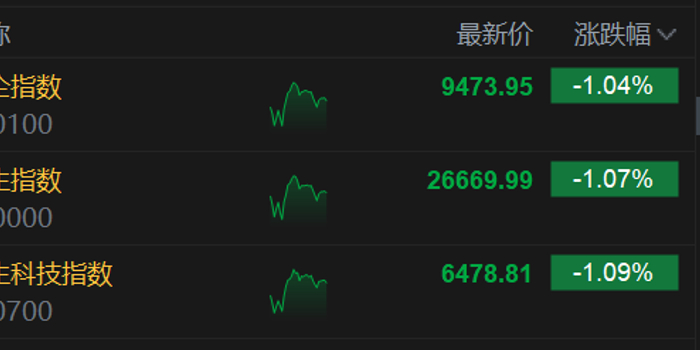 10月8日消息,港股三大指数集体下跌。截至午间收盘,恒生指数跌1.07%,报26669.99点,恒生科技指数跌1.09%,国企指数跌1.04%。盘面上,科网股跌多涨少,阿里巴巴、百度跌超3%,美团、快手、京东跌超2%,哔哩哔哩跌超1%,联想涨超2%,网易涨超1%;黄金股大涨,赤峰黄金涨超14%;稀土概念涨幅居前,金力永磁涨超6%;航空股走低,南方航空跌超5%;长风药业上市首日涨超180%。
