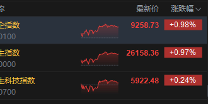 11月3日消息,港股三大指数集体上涨。截至收盘,恒生指数涨0.97%,报26158.36点,恒生科技指数涨0.24%,国企指数涨0.98%。盘面上,科网股涨多跌少,小米涨超3%,哔哩哔哩、快手、联想、网易涨超1%,阿里巴巴跌超1%;石油股走强,中海油涨超3%;航空股普涨,中国南方航空涨超4%;半导体板块跌幅居前,华虹半导体跌超3%;明略科技上市首日涨超106%。