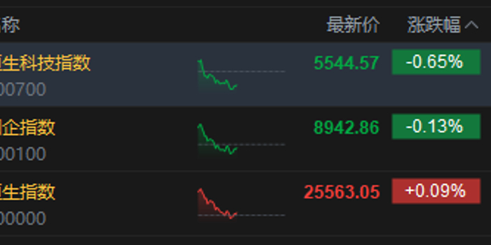 12月11日消息,港股三大指数涨跌不一。截至午间收盘,恒生指数涨0.09%,报25563.05点,恒生科技指数跌0.65%,国企指数跌0.13%。盘面上,科网股跌多涨少,哔哩哔哩涨近1%,联想跌超1%;锂电池股涨幅居前,宁德时代涨超2%;芯片股走弱,中兴通讯跌超9%;京东工业今日上市,跌0.07%。