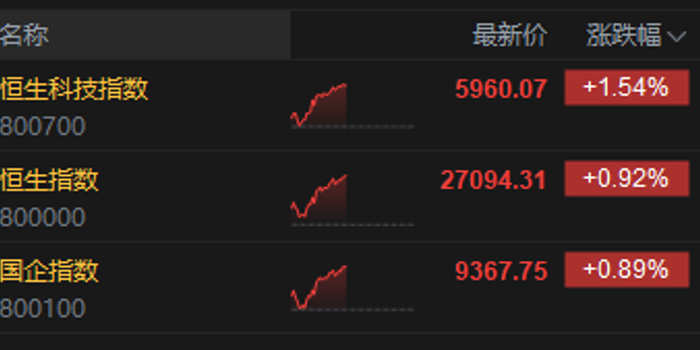 1月14日消息,港股三大指数集体上涨。截至午间收盘,恒生指数涨0.92%,报27094.31点,恒生科技指数涨1.54%,国企指数涨0.89%。盘面上,科网股涨多跌少,快手、阿里巴巴涨超5%,哔哩哔哩涨超4%,百度涨超2%,腾讯、联想涨超1%,美团跌超2%;AI医疗概念股强势,阿里健康涨超15%;加密货币概念股涨幅居前,蓝港互动涨超11%;中资券商股普涨,兴证国际涨超8%。