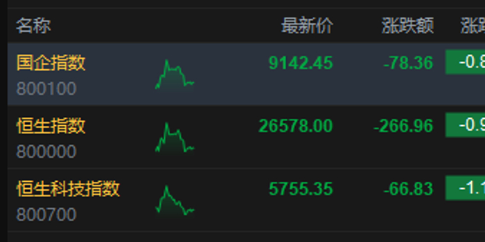 1月19日消息,港股三大指数集体下跌。截至午间收盘,恒生指数跌0.99%,报26578.00点,恒生科技指数跌1.15%,国企指数跌0.85%。盘面上,科网股跌多涨少,哔哩哔哩跌超7%,阿里巴巴跌超3%,快手跌超2%,百度涨超2%;航空股涨幅居前,东方航空涨超8%;生物医药股普跌,药明生物跌超5%;中资券商股走弱,申万宏源跌超3%。