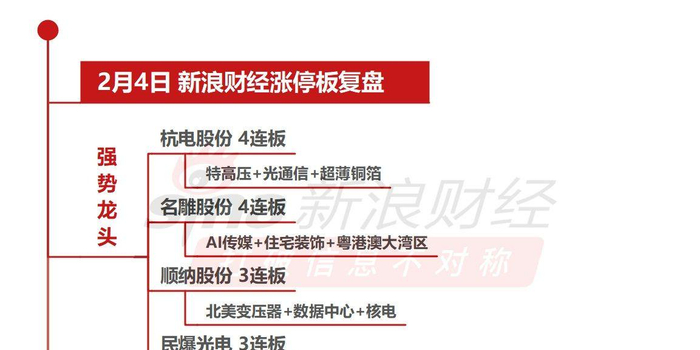 2月4日沪深两市涨停分析:杭电股份、名雕股份4连板 股市直击 02月04日 15:27 关注 确定不再关注此人吗 日k线图 沪指缩量上涨0.85%收复4100点,太空光伏、煤炭概念全线爆发,AI概念集体调整。杭电股份、名雕股份4连板,一图看懂>> 分享文章到: