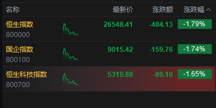 2月13日消息,港股三大指数集体下跌。截至午间收盘,恒生指数跌1.79%,报26548.41点,恒生科技指数跌1.65%,国企指数跌1.74%。盘面上,科网股集体下跌,美团跌超4%,京东、百度跌超3%,哔哩哔哩、阿里巴巴、快手跌超2%;半导体板块逆势走强,爱芯智元涨超15%;石油股跌幅居前,中石化跌超4%;黄金股普跌,紫金矿业跌超5%;今日两只新股上市。