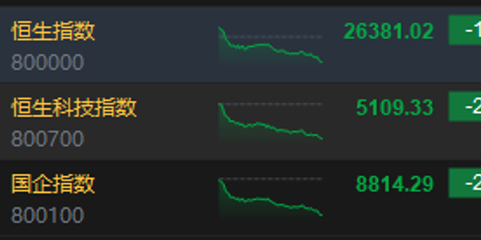 2月26日消息,港股三大指数集体下跌。截至收盘,恒生指数跌1.44%,报26381.02点,恒生科技指数跌2.87%,国企指数跌2.44%。盘面上,科网股跌多涨少,哔哩哔哩、百度、快手跌超4%,阿里巴巴跌超3%,美团、京东、腾讯跌超2%;风电股走高,东方电气大涨15%;半导体板块部分上涨,天数智芯涨超20%刷新高;汽车经销商板块走低,中升控股跌超10%。